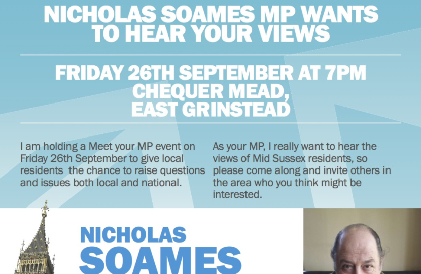 Nicholas Soames wants to hear the views of Mid Sussex residents, please come along to Chequer Mead on Friday 26th September, 7.00pm and invite others in the area that you think might be interested.