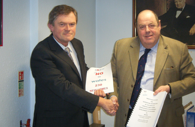 Nicholas Soames accepting a petition from John Ely on behalf of Lindfield residents objecting to the Wates’ proposal for 230 new houses on land to the east of Lindfield.